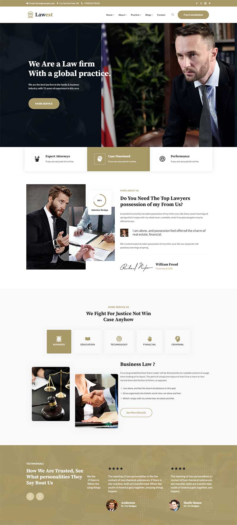 响应式律师事务所静态网页模板,适配不同屏幕,以严谨大气布局呈现业务领域、律师团队,助力律所高效树立专业形象 。