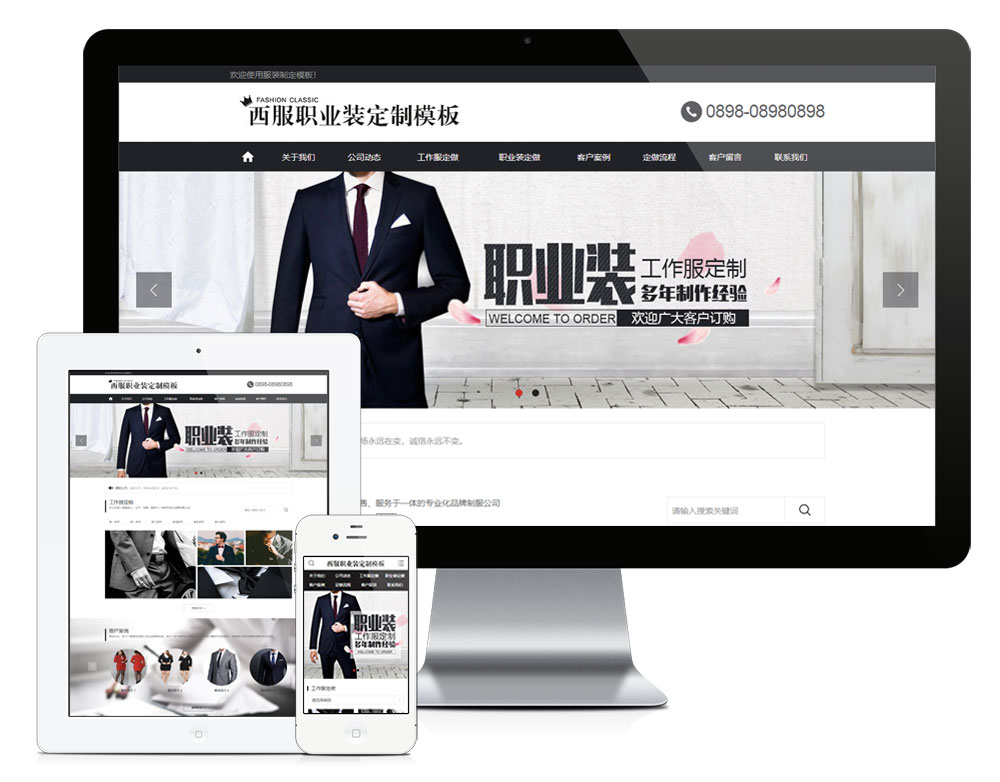 • 这是一套服装定制类网站模板,适用于西装西服定制、职业装定制、服装设计等公司网站模板,模板采用黑白主基调,衬托出西服的端庄大气,模板自带EyouCms内核,无需再下载EyouCms系统,原创设计代码、手工DIV+CSS,自适应手机端和电脑端。