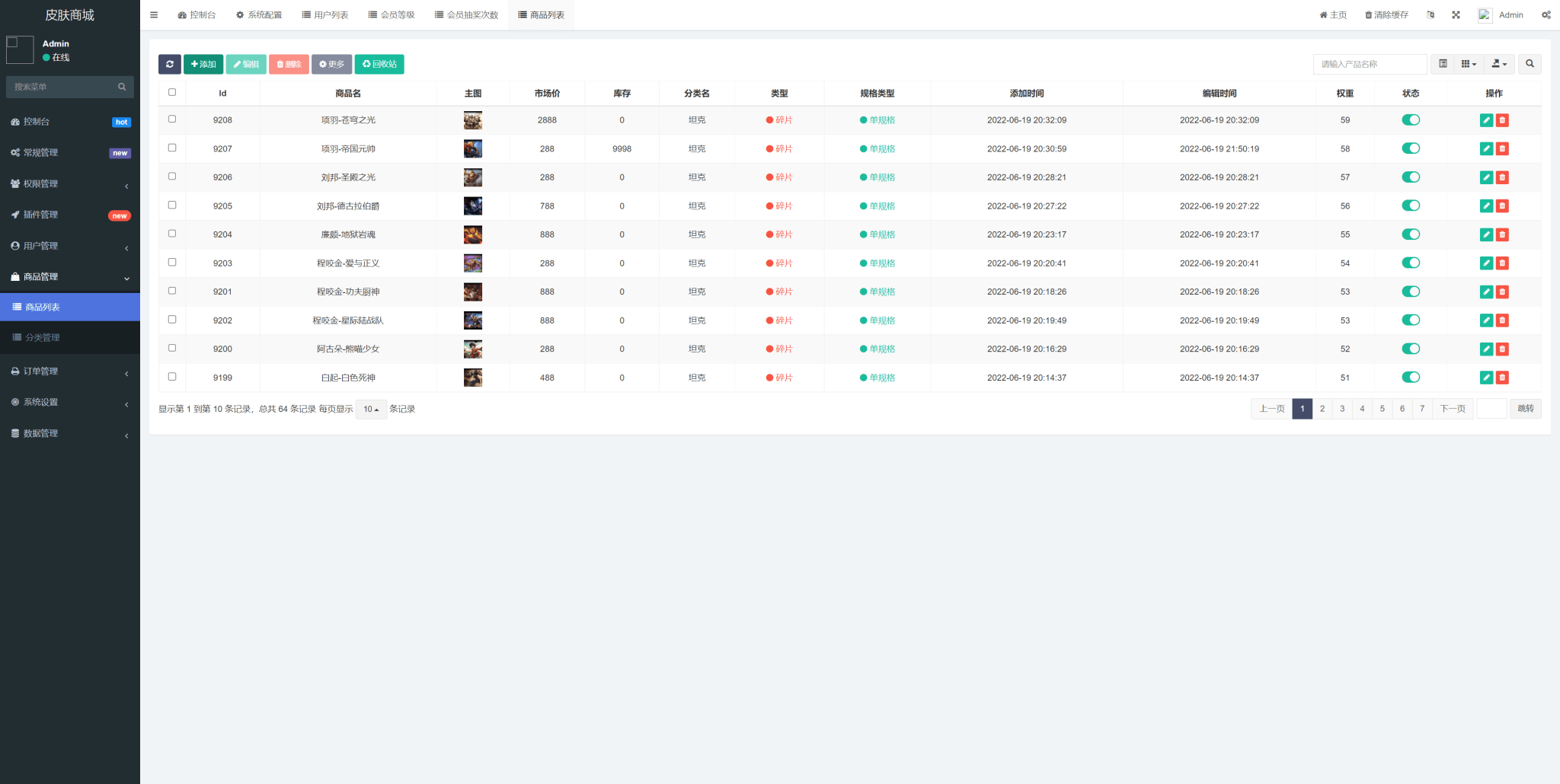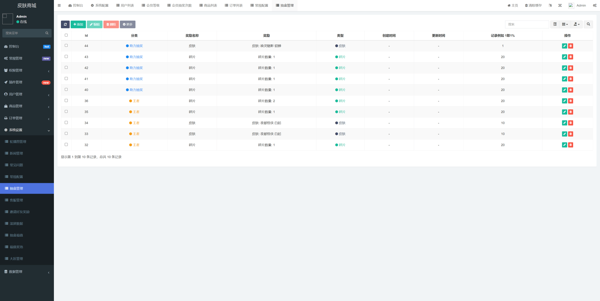 • 全新二开运营版王者荣耀皮肤抽奖系统,游戏皮肤盲盒商城,前端uniapp,API端thinkphp,后端FastAdmin框架