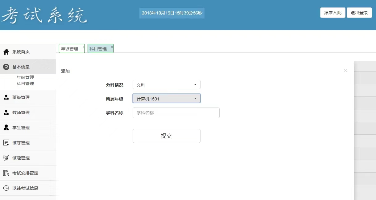 登陆 学生管理 教师管理 班级管理 年级管理 科目管理 试题管理 试卷管理 考试安排 查看以往考试信息 考试成绩统计