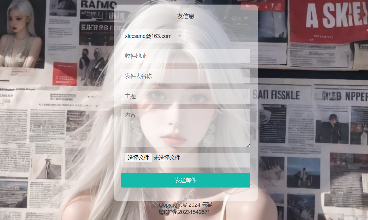 免登录邮件发送系统源码,支持添加附件,后台可添加邮箱,前台可选择发送邮箱