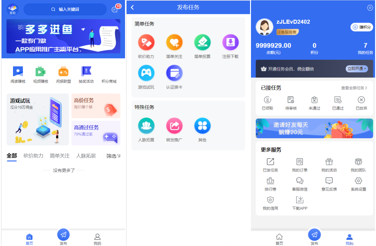 7. 数据统计:包含联盟财务、任务反馈、用户财务及平台数据分析等多维度统计。